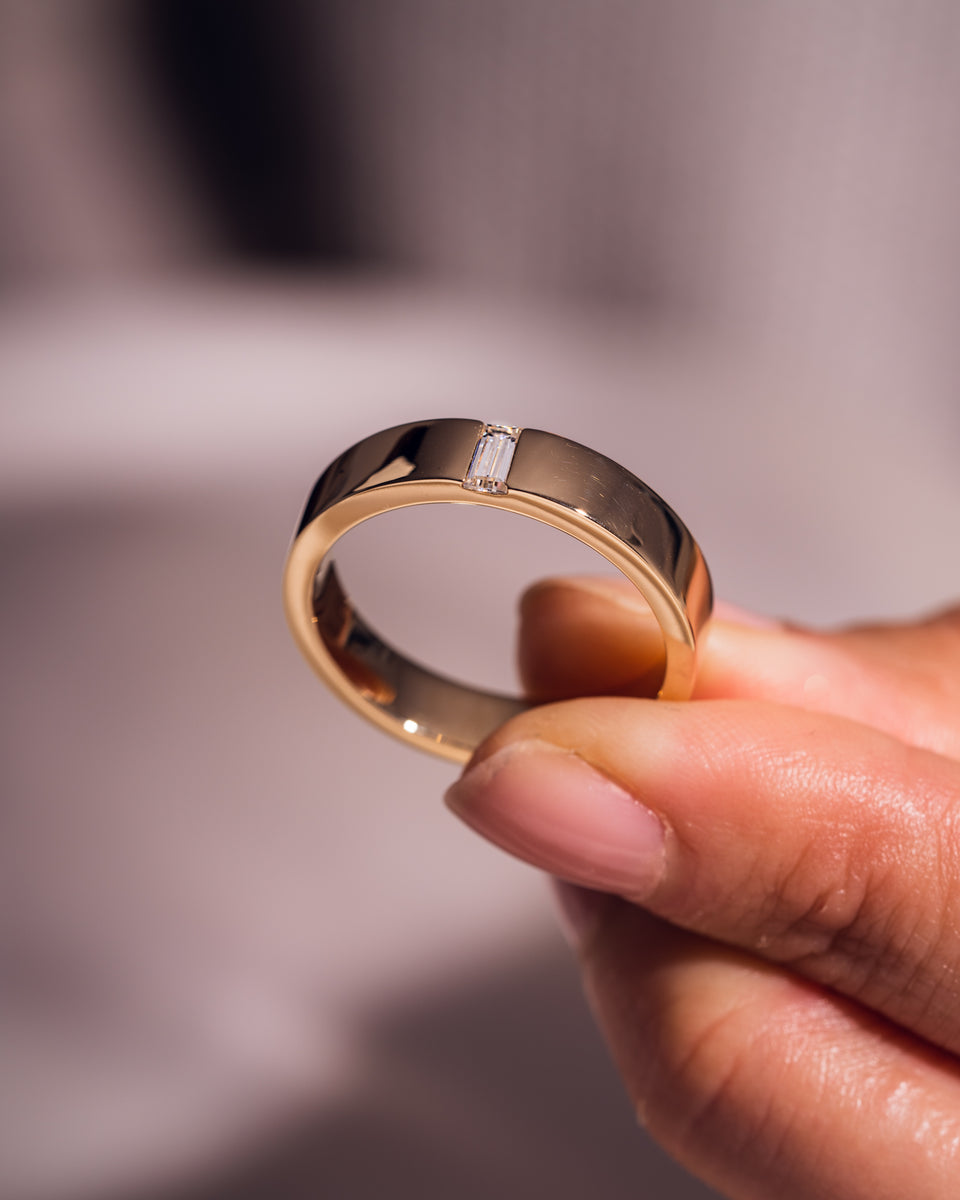 When choosing a wedding band, we recommend first considering the metal, then the style and diamonds or gemstones of the engagement ring as a guide. The metals do not necessarily have to match, as mixed metals give a modern look. When considering the style of the wedding band, determine if you prefer the band to sit flush against the engagement ring or for there to be a small gap. For a wedding band that sits flush against the engagement ring, we recommend a classic band (plain metal, pavé or eternity), contoured bands or notched wedding bands.